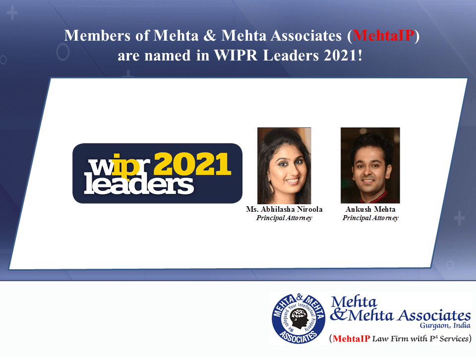 We are pleased to share that members of Mehta & Mehta Associates (MehtaIP) – Ankush Mehta and Abhilasha Niroola have been named in the 2021 edition of WIPR Leaders. Profiling the leading IP practitioners from around the world, WIPR Leaders consists of a directory of entrants. All Leaders were chosen after a four month nomination process, in which WIPR sought views from 12,000 IP professionals.